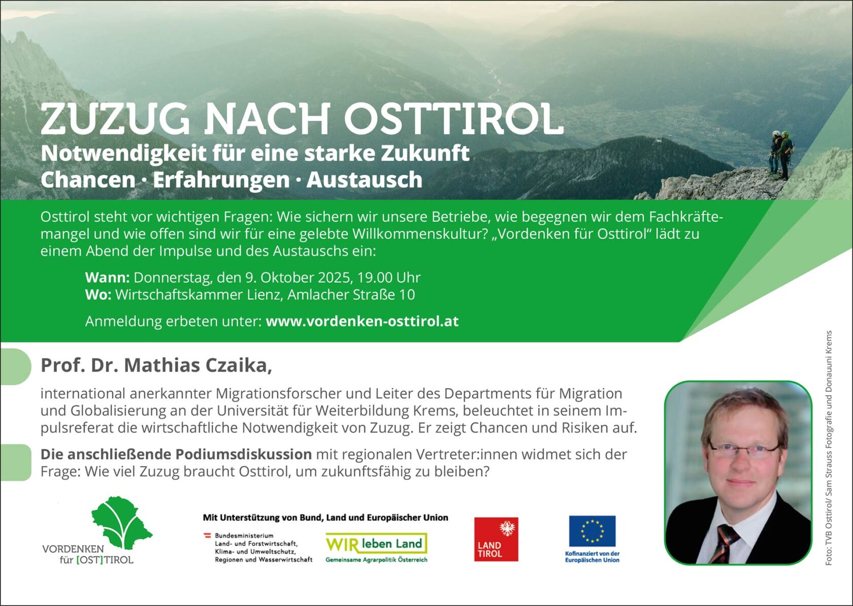 Osttirol steht vor wichtigen Fragen: Wie sichern wir unsere Betriebe, wie begegnen wir dem Fachkräftemangel und wie offen sind wir für eine gelebte Willkommenskultur? „Vordenken für Osttirol“ lädt zu einem Abend der Impulse und des Austauschs ein: